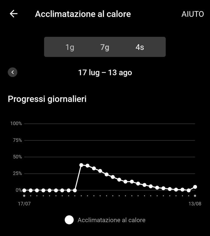 Sono rientrato questa settimana dalla Germania e sto soffrendo molto il caldo. Ero curioso di vedere come rispondeva il grafico dell'acclimatamento al calore ai miei "sforzi", domenica scorsa ho fatto 14km lenti ma con il cuore una decina di battiti sopra il mio "normale" proprio a causa del calore ma il grafico non si è mosso affatto. Stamattina 3km facili e mi da +5%... Un mesetto fa avevo fatto una corsa lunghetta sempre a Roma in compagnia e l'acclimatamento mi era balzato in su tipo al 30%... Perché domenica scorsa no?